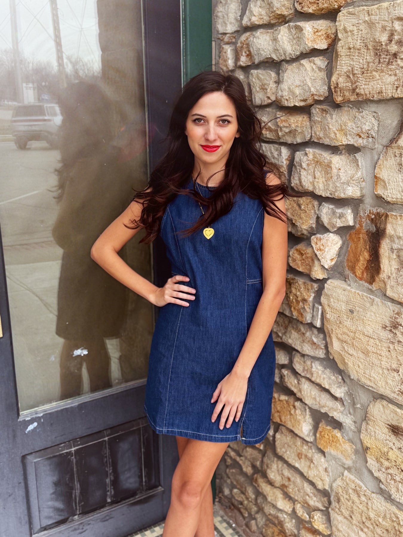 Round neckline Sleeveless Back metal zipper Side slit Not lined Solid Denim pattern Mini dress 100% cotton
