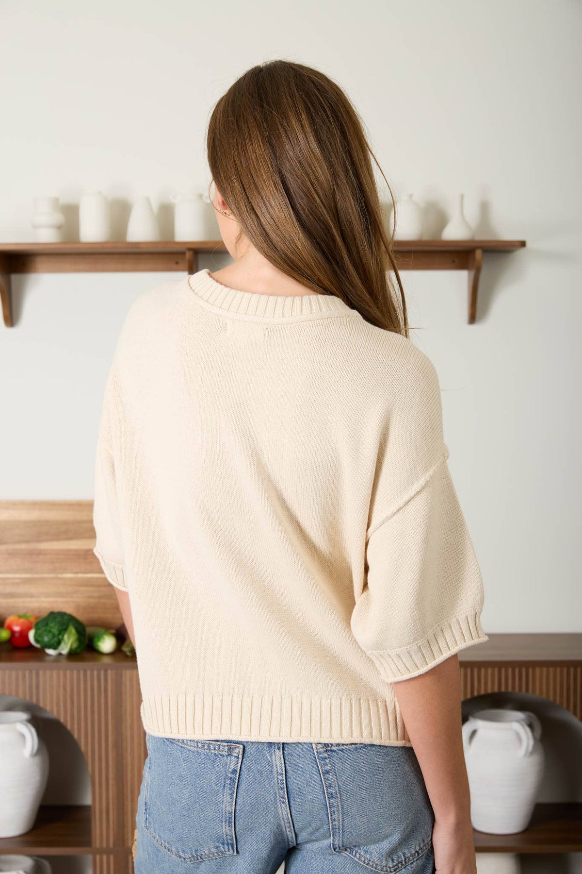 ROUND NECKLINE SHORT SLEEVES BUTTON DOWN EXPOSED SEAM RAW EDGE TRIM DETAIL NOT LINED SOLID KNIT CARDIGAN SWEATER 60%COTTON 40%ACRYLIC