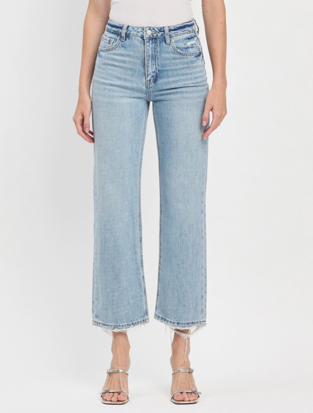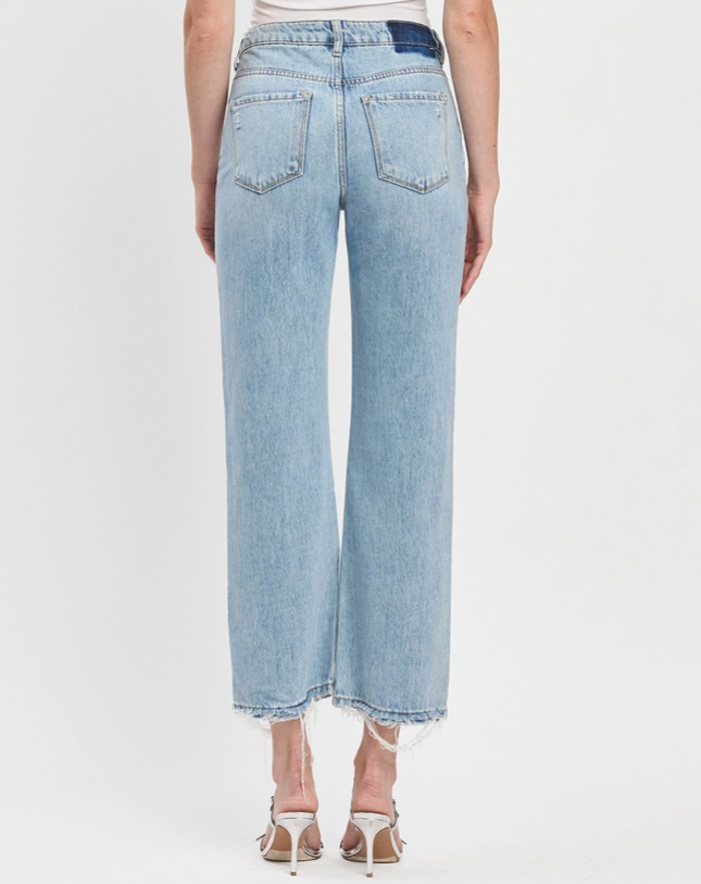 Non stretch denim, super high rise, 5 pockets, distressed detail, ankle length, light wash, 90's slim wide jeans